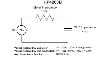當(dāng)從測試設(shè)備中將1.0 Vrms的電壓加到電容器時(shí),電壓在儀表阻抗和電容器阻抗之間被分壓。對于HP4263B測試儀,其阻抗保持為100 Ω不變(圖1),而對于HP4278A測試儀,計(jì)算的電容器阻抗變?yōu)?.5 Ω(圖2)。結(jié)果表明,對于HP4263B測試儀,絕大多數(shù)外加電壓會(huì)降低在測試儀阻抗中,而HP4278A測試儀可以使電容器能夠接收大部分外加電壓。因此,HP4263B測試儀顯示的測量值將低于真實(shí)值。