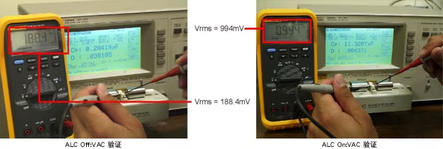 下圖展示了ALC on和off之間的差異。當(dāng)ALC功能off時(shí),電容器上的實(shí)際電壓約為1.0Vrms設(shè)定電壓的10%。當(dāng)ALC功能on時(shí),電容器上的電壓幾乎是設(shè)定電壓的100%。HP4284A具有電壓和電流等級監(jiān)視器,但還是可以使用伏特計(jì)驗(yàn)證實(shí)際電壓。